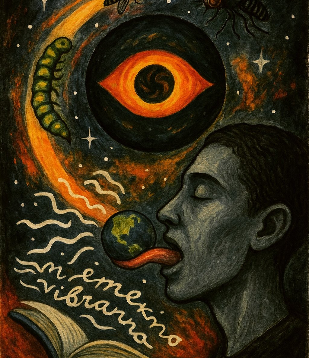 O cão chora. Coração late, me bate. Acorrentado, carne viva comida para um punhado de vermes, ferida adentro. Moscas (memento mors)… estes kamikazes insaciáveis, invadem quaisquer pontos cegos onde possam beijar com seus tubos gástricos. ¿Quanto tempo dura uma mosca? um dia.¿Quanto tempo dura uma memória? Exatamente, cravado. Em termos humanos, na maioria, é uma gratuita e a priori vingança — Não basta uma mosca, nasceu verme. ¿Seria, a mosca, uma metamorfose — fruto de vermes com paladar mais refinado? Um verme que não suportou mais o sabor da carne podre e simplesmente renunciou à adaptação natural, passou fome até se inanimar, consumiu a si próprio e de seus restos surgiram patas e olhos e asas. Agora, ele e sua descendência podem comer carne viva, quentinha. Bovina? Anca, lombo, por que não canina? A humana ao alho e óleo, delícia. Ainda, alguns de sua prole estão se especializando em animais marinhos, outros audaciosos querem aves e répteis. Todos por uma e mesma razão — questão de gosto. Degustação de vidas pela vida. O sentido de cada nascimento, cada morte, é o do universo sentindo o sabor de si mesmo pelas mais variadas existências. Viver é dar continuidade a um movimento, mas isso é efeito, a causa da multiplicidade dos seres é experimentar. ¿Do contrário, se a causa fosse apenas transmitir vida, o movimento não seria só um vibrador para trocar genes? Olhar miópe, não é apenas um vibrador com qualquer formato, mas como sendo o próprio constitutivo de formar. ¿O vibrar, outra lente, não está em qualquer coisa, tanto em nível mental quanto em espacial?¿Se opera nestes níveis, se aparece em ambos, quais são estas operações? Nestas vibrações aparece algo que não está ali, nem a nível mental nem espacial. ¿Há outros níveis, outras percepções? ¿Há padrões nestes níveis outros? ¿Sabor? ¿Beleza? Amor(‘a’: negação + radical mo, isto é, sem moscas). As formas em constante variação como caminho que leva a consciência a perceber, intuir, saborear este outro nível. Palavras que levam a mente a se desvincular da percepção, através da atenção a estas mesmas percepções.¿Verme atenciona a própria consciência? ¿E o que aparece ali?bzzzbzzz. Ao prestar atenção na consciência, pode-se se distinguir dela. E, uma vez distinto, o vínculo com a consciência se desfaz. ¿Mente sem vínculos? ¿O que aparece, então? Uma mosca, na têmpora oleosa de um artrópode incapaz de se mover para espantá-la. ¿O que resta a fazer? Tentar sugá-la quando se aproximar da boca e espremê-la no céu da boca com a língua. Se o que importa é o universo experimentar a si mesmo de todas as formas, alguém vai ter que saborear esta mosca.