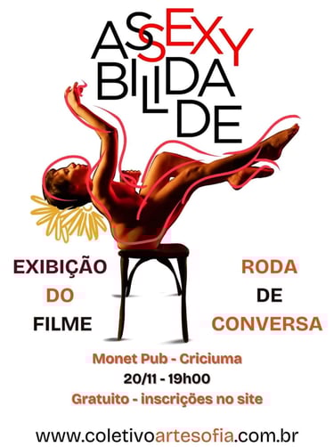 Exibição do filme Assexybilidade, sobre deficiência e sexualidade, que foi censurado no festival de cinema catarina; no Pub Monet, em Cricíuma. Seguido de uma roda de conversa entre coletivo ArteSofia, movimentos de pessoas com deficiência e outros participantes.